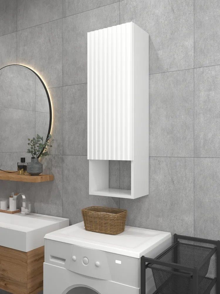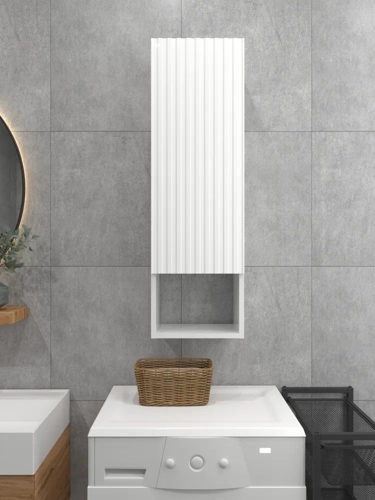 Белый шкаф с рифлёным фасадом будет отлично и стильно смотреться как в ванной, так и в туалете.